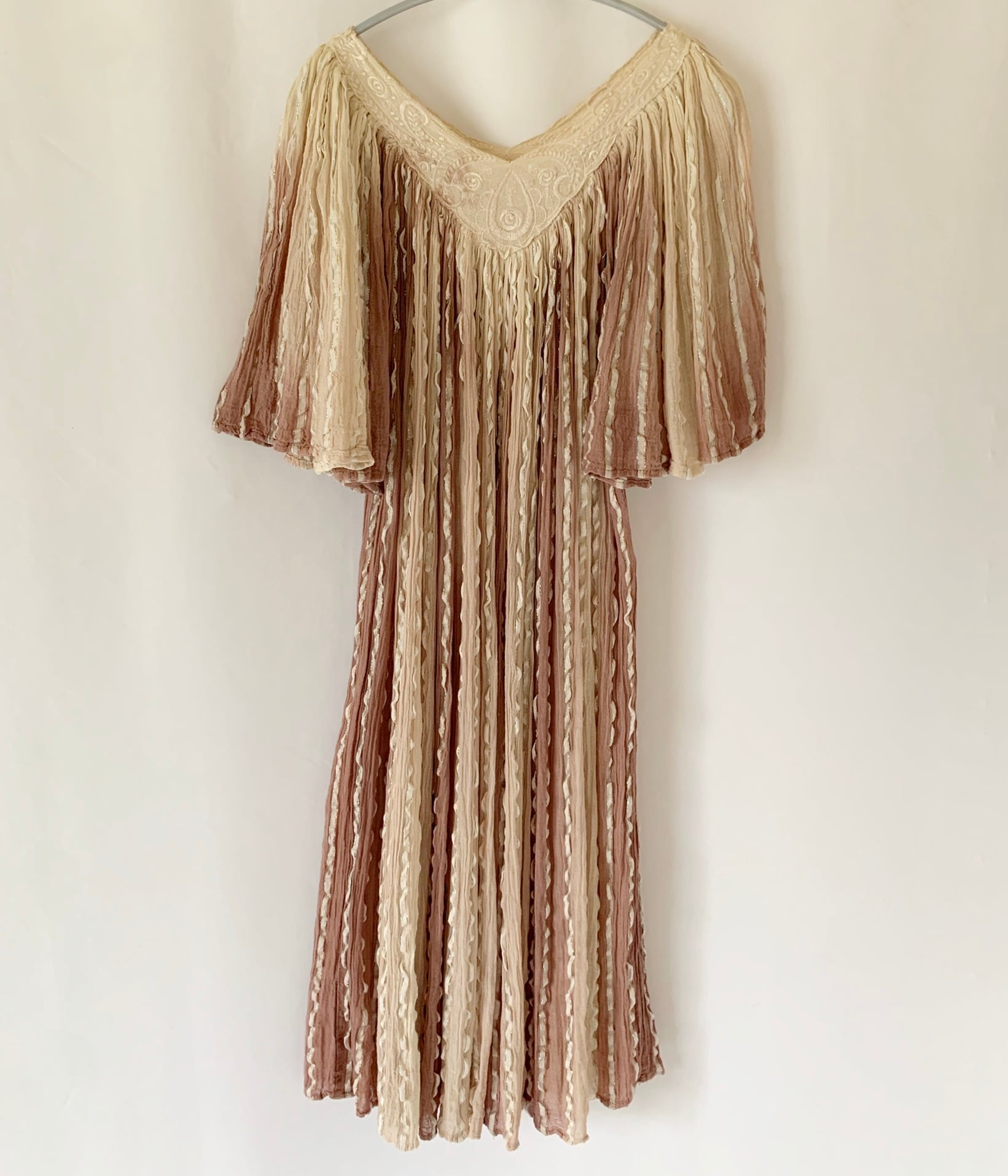 胸元の刺繍と、落ち着いたピンクのグラデーションがとても素敵な1枚です。