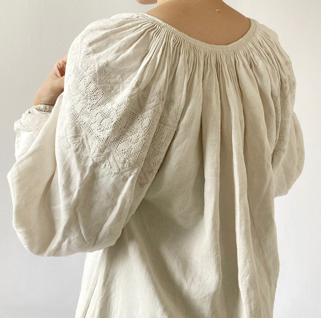 白地のリネン生地に白の透かしの刺繍がとても美しい1枚で、