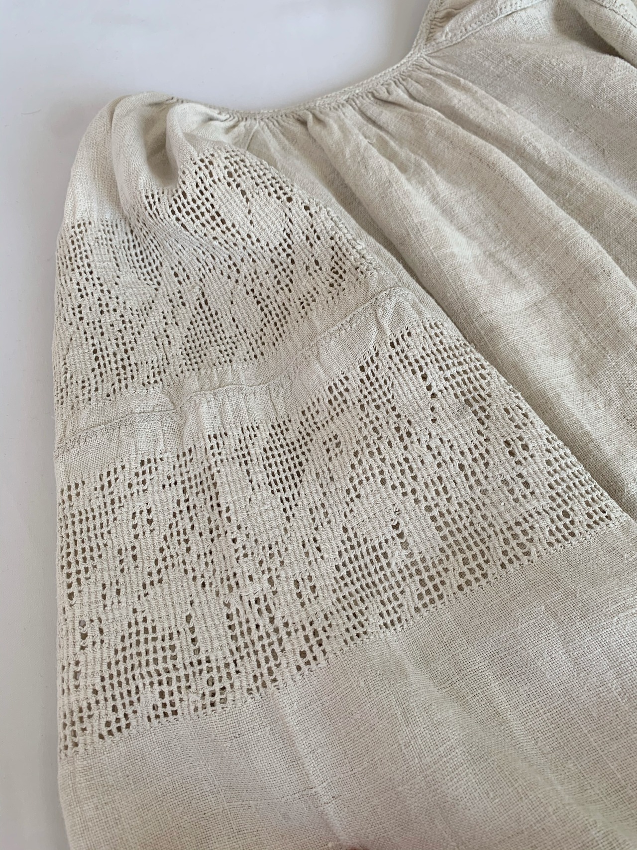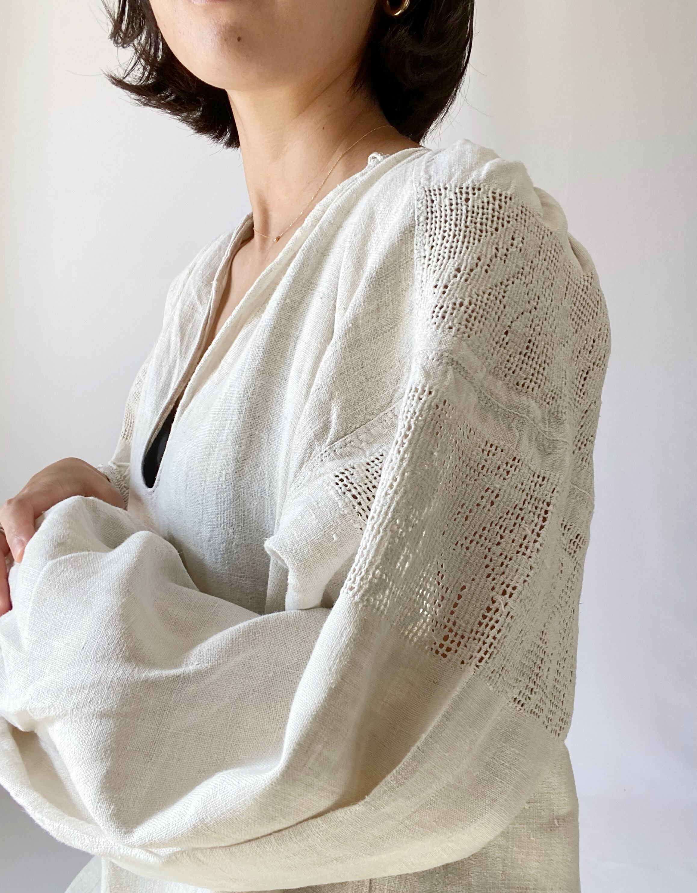 白地のリネン生地に白の透かしの刺繍がとても美しい1枚で、